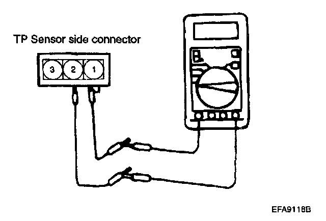 2. Using jumper wires, connect a voltmeter between terminal 1 (sensor ground) and terminal 2 (idle switch) of the throttle position sensor connector.