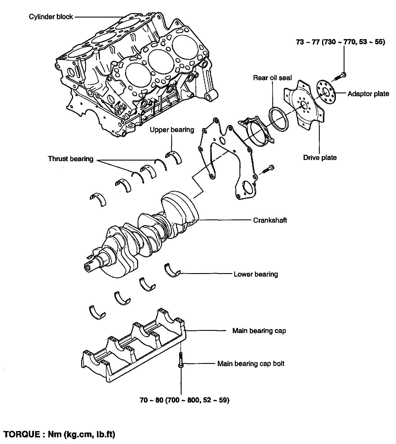 Main bearing cap bolts 70 - 80 Nm (700 - 800 kgf-cm, 52 - 59 ft. lbs.)
