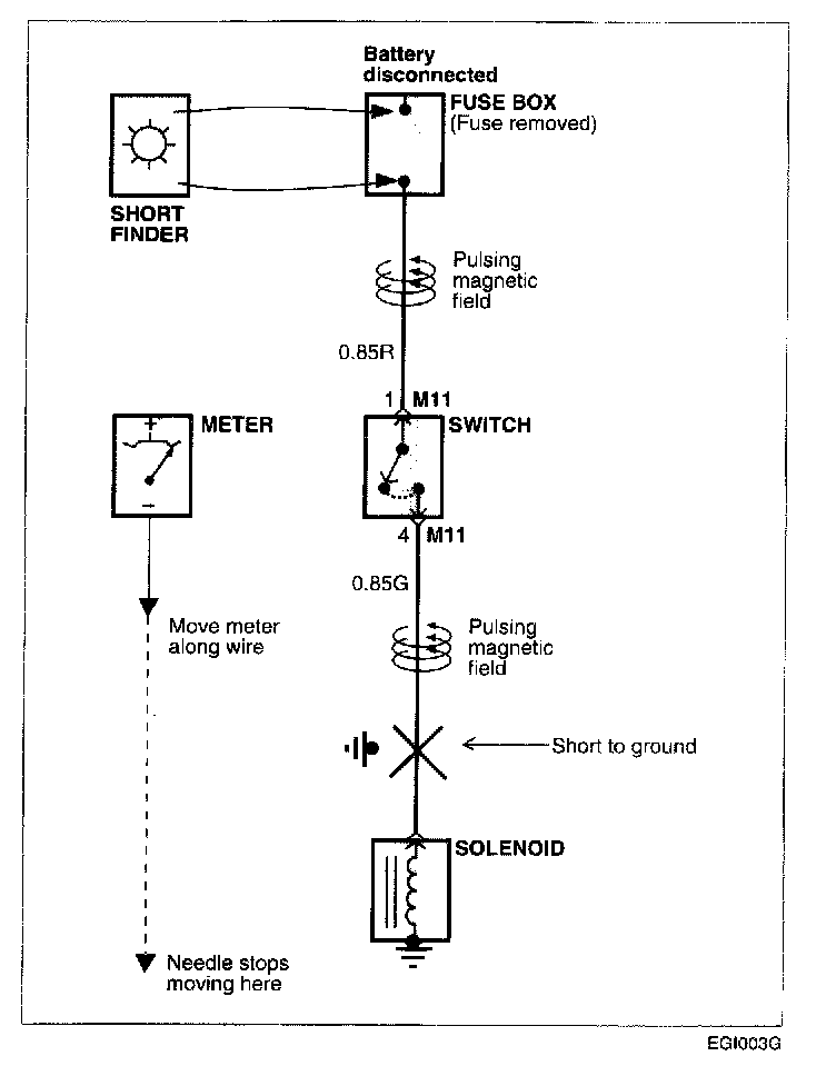 e. Beginning at the fuse box, slowly move the short tinder along the circuit wiring. The meter will show current pulses through sheet metal and body trim. As long as the meter is between the fuse and the short, the needle will move with each current pulse. Once the meter is moved past the point of the short, the needle will stop moving. Check around this area to locate the cause of the short circuit.