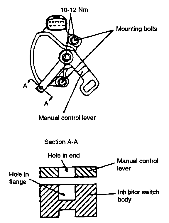 4. Loosen the transaxle range switch body mounting bolts and then turn the transaxle range switch body so the hole in the end of the manual control lever and the hole (cross section A-A in the figure) in the flange of the transaxle range switch body flange are aligned.