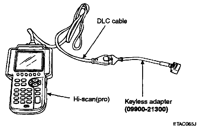 1. To register transmitter code, first connect keyless adapter (09900-21300) to DLC (Data Link Connector) cable of hi-scan as shown in the illustration.