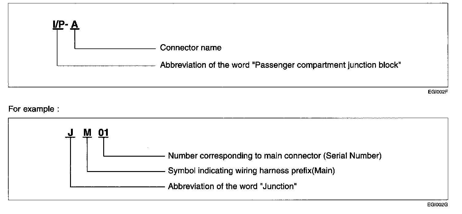 A junction block identification symbol consists of a wiring harness location classification symbol corresponding to a wiring harness location and number corresponding to the connector in the junction block.