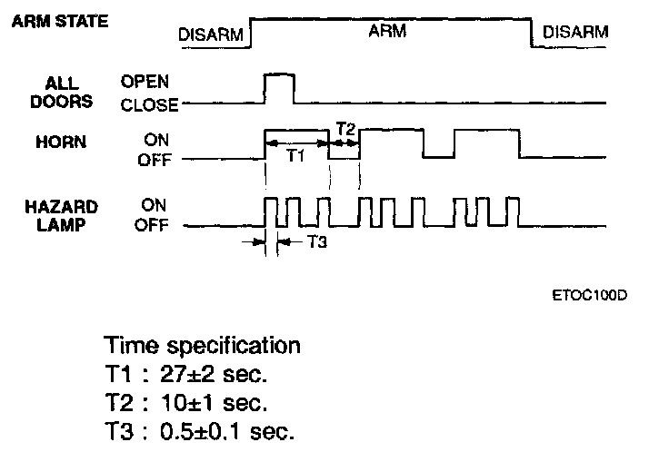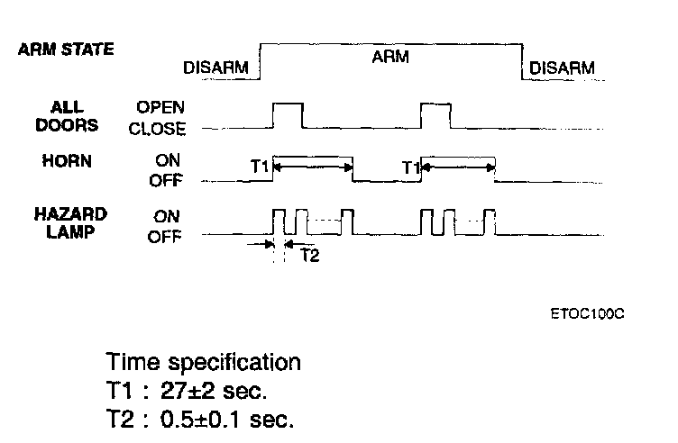 Horn and start inhibition are OFF Hazard lamp is flashed one time (period : 2 sec, duty: 50%, within 2 sec.) The state goes to arming mode (after a lock state check) The start is enabled