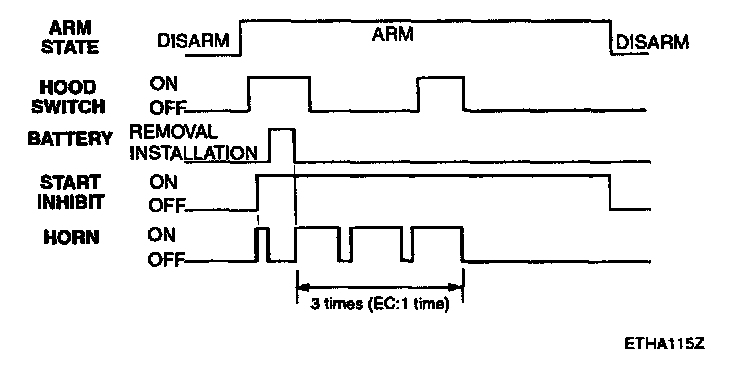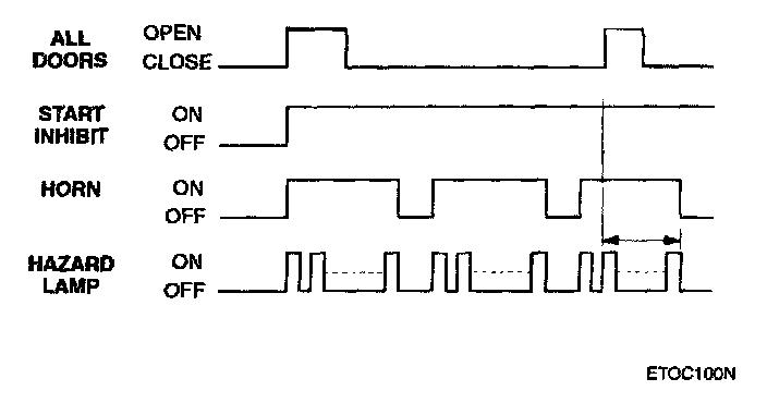 This system enters the armed state if it is in the pre-armed state and, after 0.6 sec, check actuator lock and each door, hood and tail gate close, and no door warning switch (no key in ignition). On entering the arm state, a single flash of the hazard lamps is given, period of cycle 2 second, duty rate 50%.