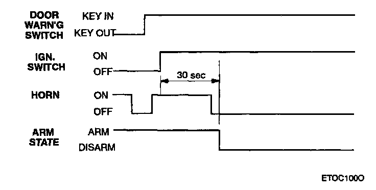 After the alarm state or start inhibit state are entered, if door warning switch on (key in ignition) & IGN 2 ON, if IGN 2 state is changed to OFF within 30 sec, remain in alarm state.