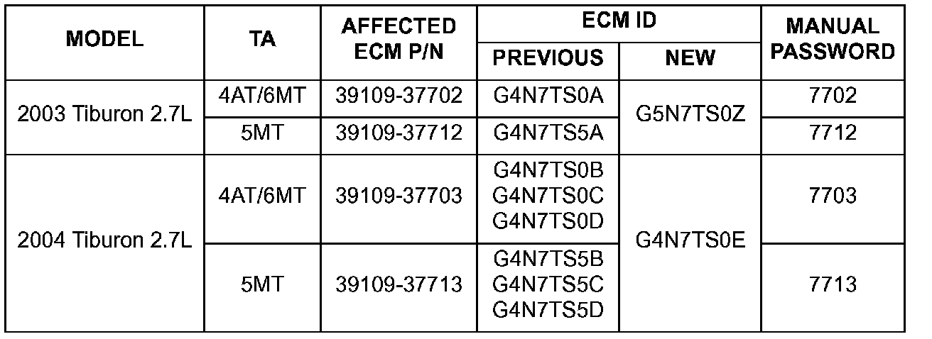 ^ Model: Some 2003-2004 TIBURON vehicles with 2.7L engines