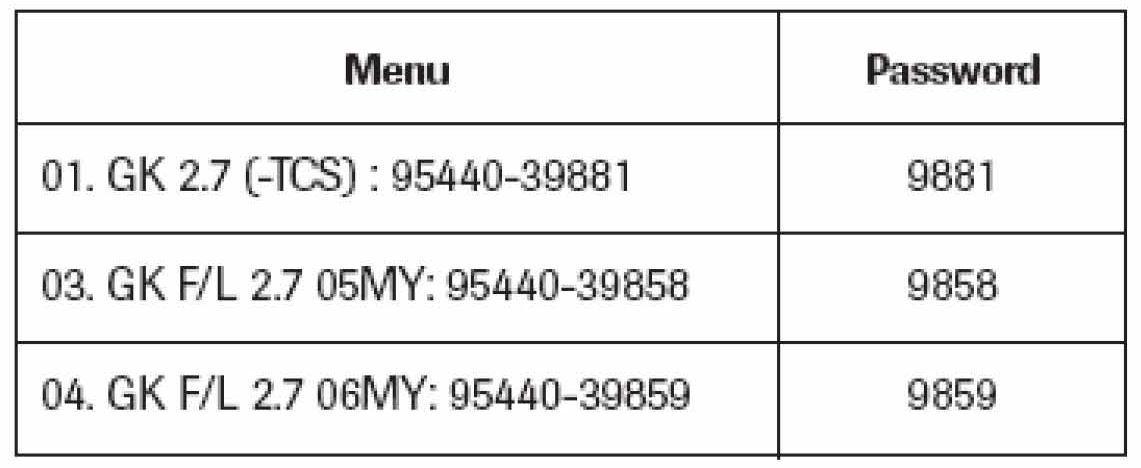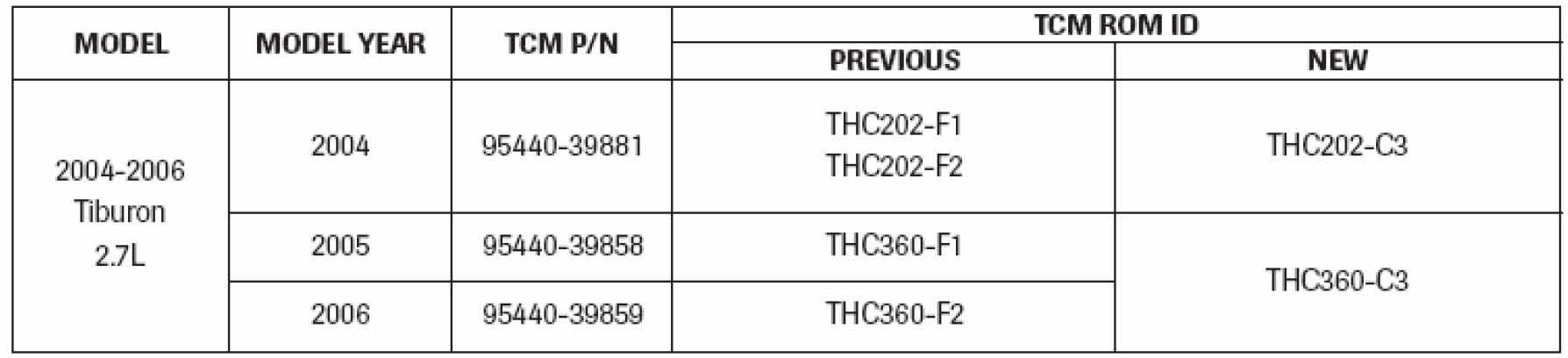 ^ Model: 2004~2006 Tiburon vehicles with 2.7L gasoline engine and automatic transaxle.