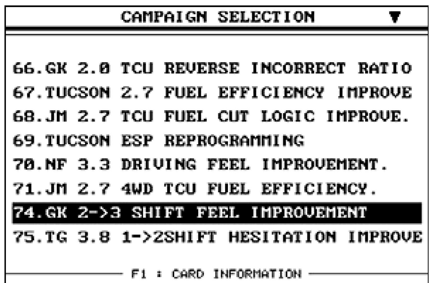 3. Select option "74. GK 2->3 SHIFT FEEL IMPROVEMENT" and press ENTER.