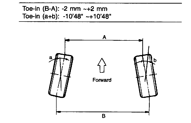 Toe-in (B-A or angle a+b) is adjusted by turning the tie rod turnbuckles. Toe in on the left front wheel can be reduced by turning the tie rod toward the rear of the car. Toe change is adjusted by turning the tie rod of the right and left wheels simultaneously in the same amount as follows:
