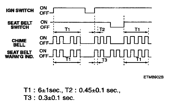 3. When the ignition is already switched ON, if the seat belt is removed, the warning indicator and the chime bell are output for total time 6 seconds