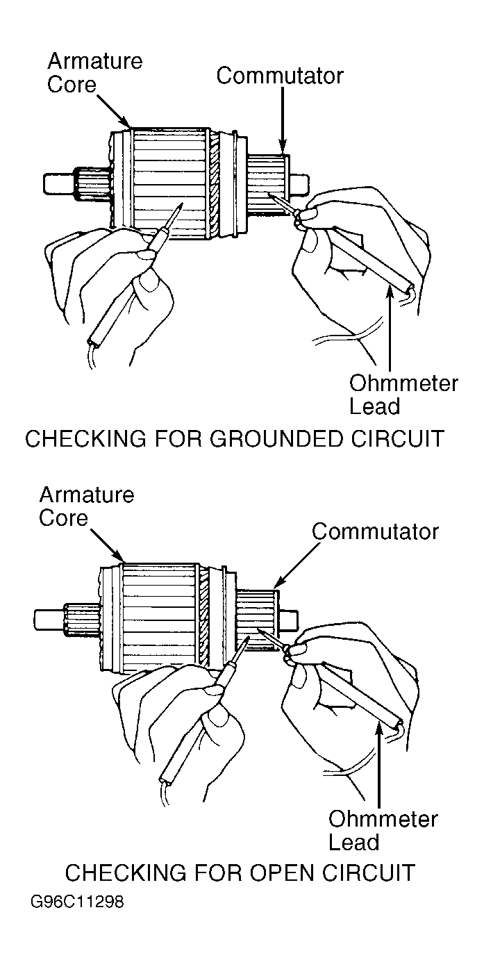 1. To check armature for a grounded circuit, check continuity between commutator and armature coil core. See Fig 1 . No continuity should exist. Replace armature if continuity exists.