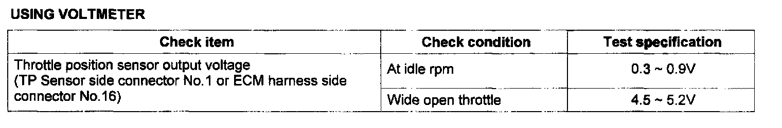 Throttle position sensor: 1.5 - 2.5 Nm (15 - 25 kg.cm, 1.1 - 1.8 lb.ft)