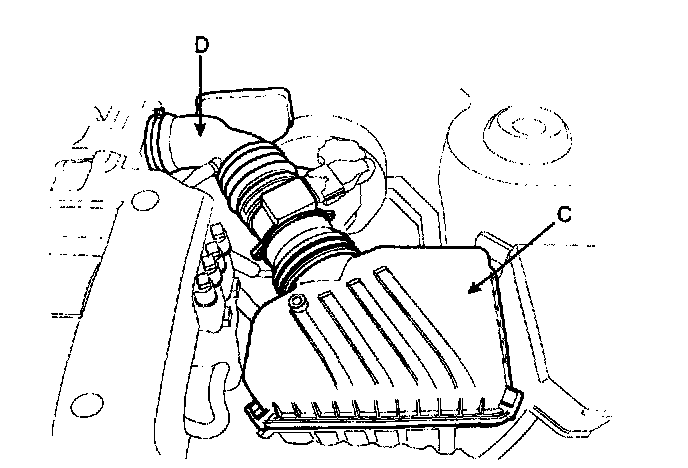 a. Air cleaner upper cover (C) and air intake hose (D).