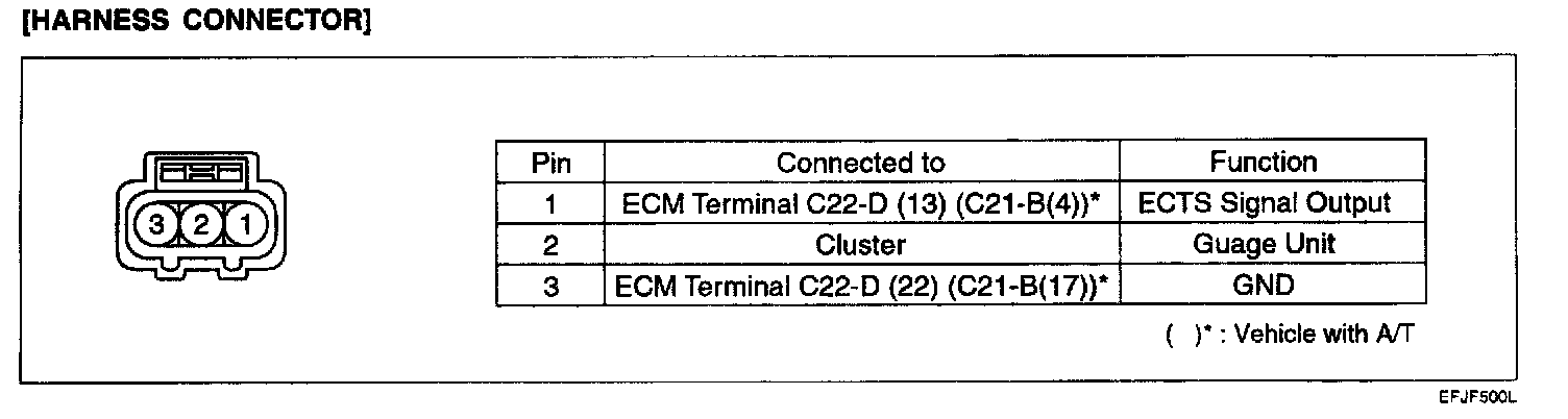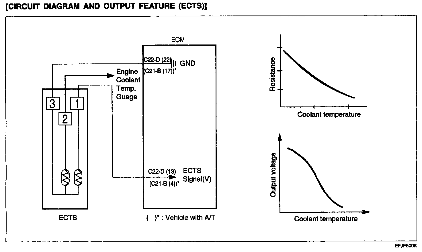 ENGINE COOLANT TEMPERATURE SENSOR (WTS)Engine Coolant Temperature Sensor (ECTS) installed in the engine coolant passage of the cylinder head detects the engine coolant temperature and emits signals to the ECM. This part employs a thermistor which is sensitive to change in temperature. The electric resistance of the thermistor decreases in response to a temperature rise (NTC). The ECM determines engine coolant temperature by the sensor output voltage and provides optimum fuel enrichment when the engine is cold.