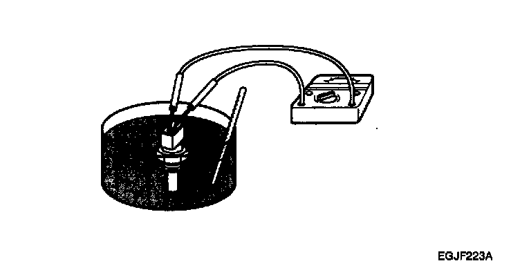 2. With the temperature sensing portion of Engine Coolant Temperature Sensor (ECTS) immersed in hot engine coolant, check the resistance.