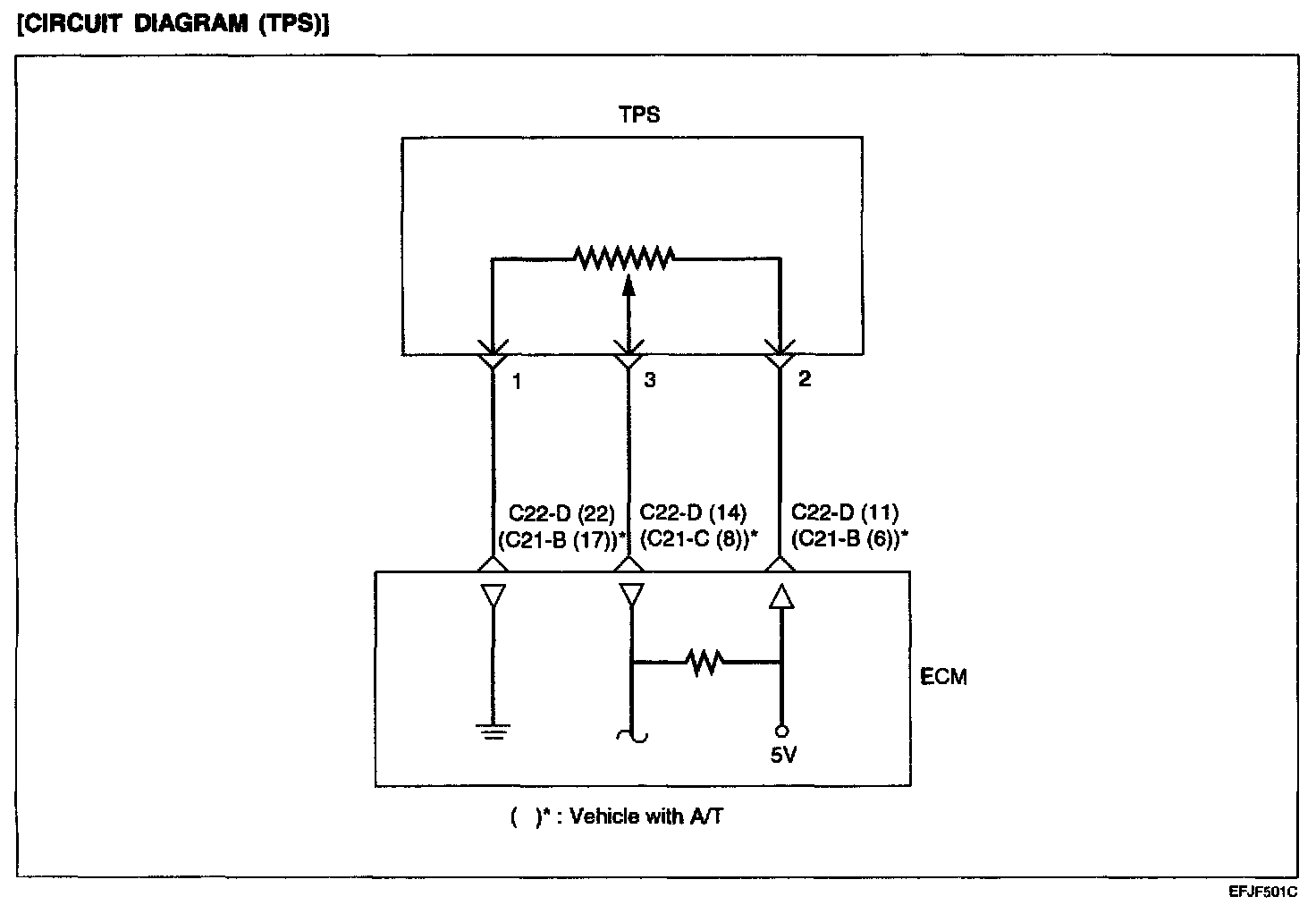 The TPS is a variable resistor type that rotates with the throttle body throttle shaft to sense the throttle valve angle. As the throttle shaft rotates, the output voltage of the TPS changes. The ECM detects the throttle valve opening based on voltage change.