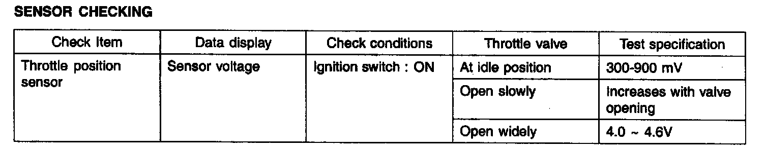 3. Turn the ignition switch to the ON position (do not start engine) and check that the TP Sensor output voltage is as specified. If a HI-SCAN is used, read the voltage.