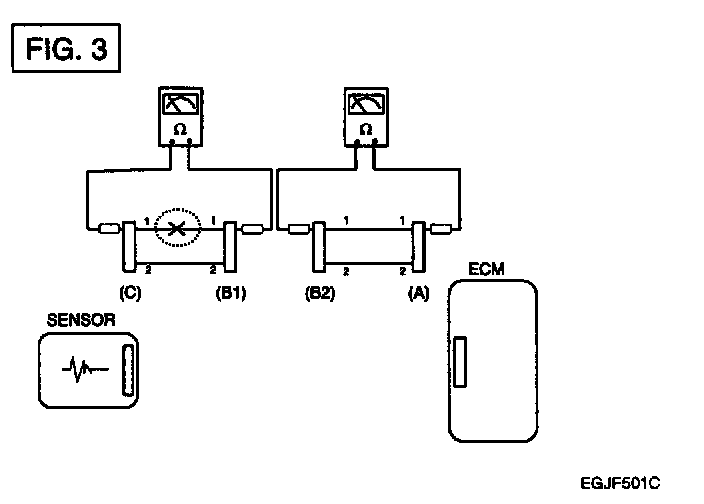 b. Disconnect connector (B), and measure for resistance between connector (C) and (B1) and between (B2) and (A) as shown in [FIG. 3].