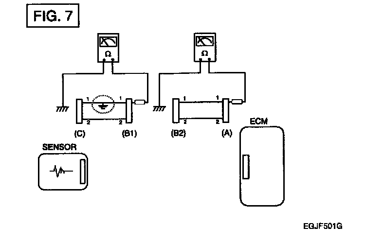 b. Disconnect connector (B), and measure the resistance between connector (A) and chassis ground, and between (B1) and chassis ground as shown in [FIG.7].