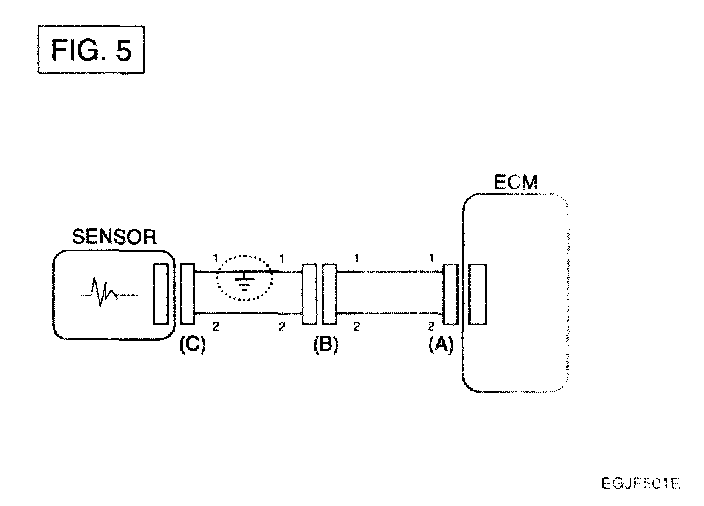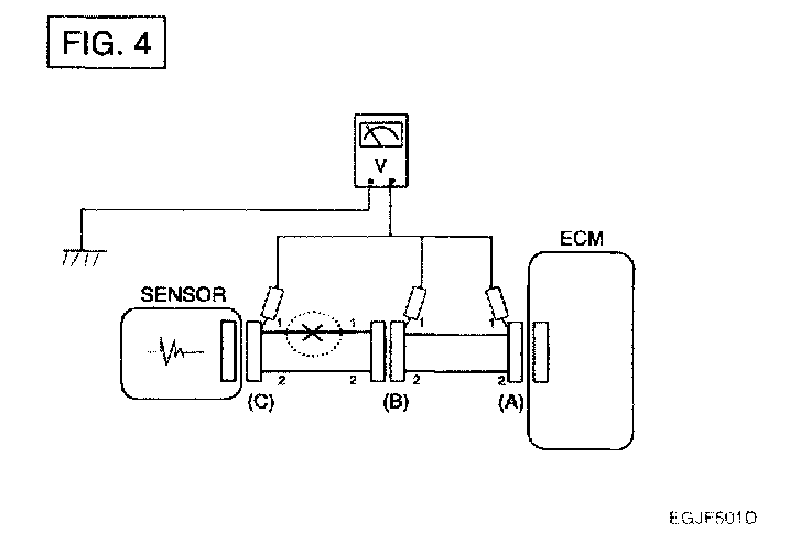 a. With each connector still connected, measure the voltage between the chassis ground and terminal 1 of each connectors (A), (B) and (C) as shown in [FIG. 4].