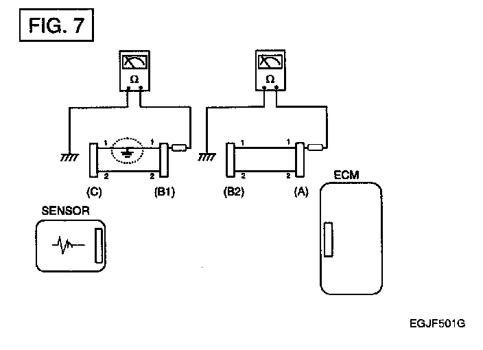 b. Disconnect connector (B), and measure the resistance between connector (A) and chassis ground, and between (B1) and chassis ground as shown in [FIG.7].