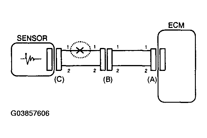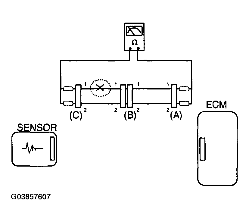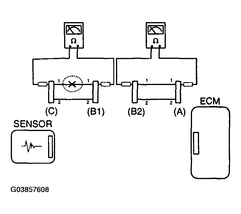 In this case the measured resistance between connector (C) and (B1) is higher than 1 MΩ and the open circuit is between terminal 1 of connector (C) and terminal 1 of connector (B1).
