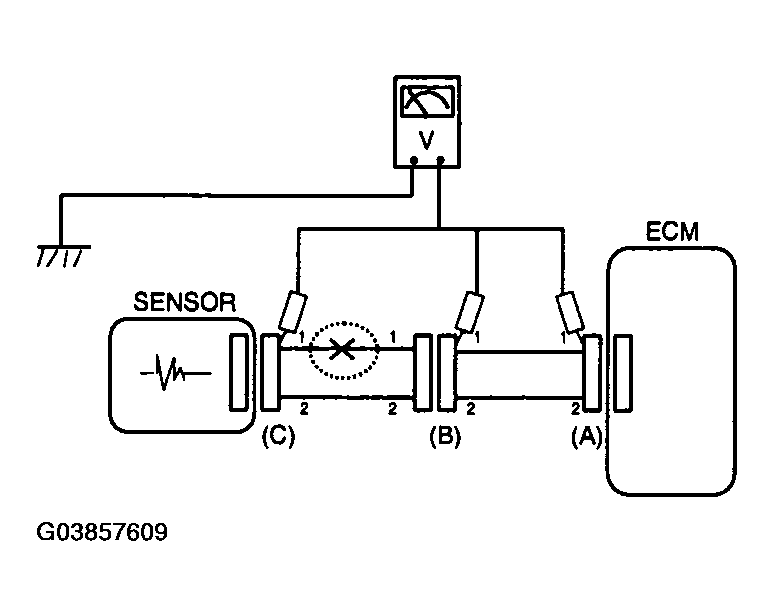 - With each connector still connected, measure the voltage between the chassis ground and terminal 1 of each connectors (A), (B) and (C) as shown in Fig 4.