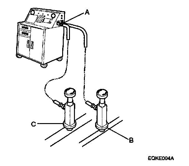 1. Connect a R-134a refrigerant recover/recycling/charging station(A) to the high-pressure service port(B) and the low-pressure service port(C), as shown, following the equipment manufacture 5 instructions.