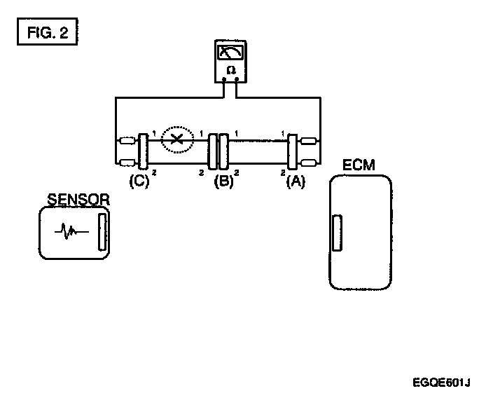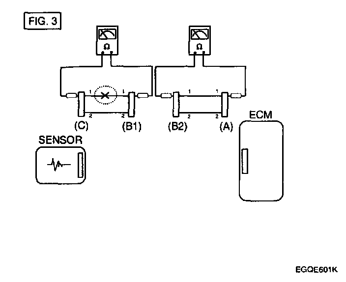 b. Disconnect connector (B), and measure for resistance between connector (C) and (B1) and between (B2) and (A) as shown in [FIG. 3].