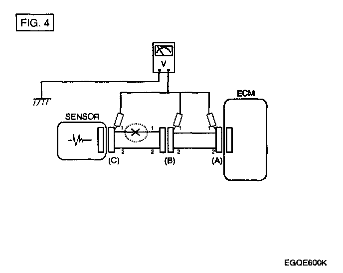 a. With each connector still connected, measure the voltage between the chassis ground and terminal 1 of each connectors (A), (B) and (C) as shown in [FIG. 4].