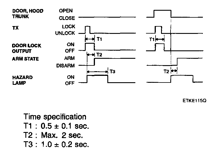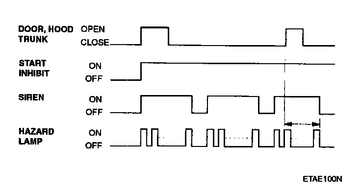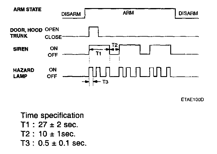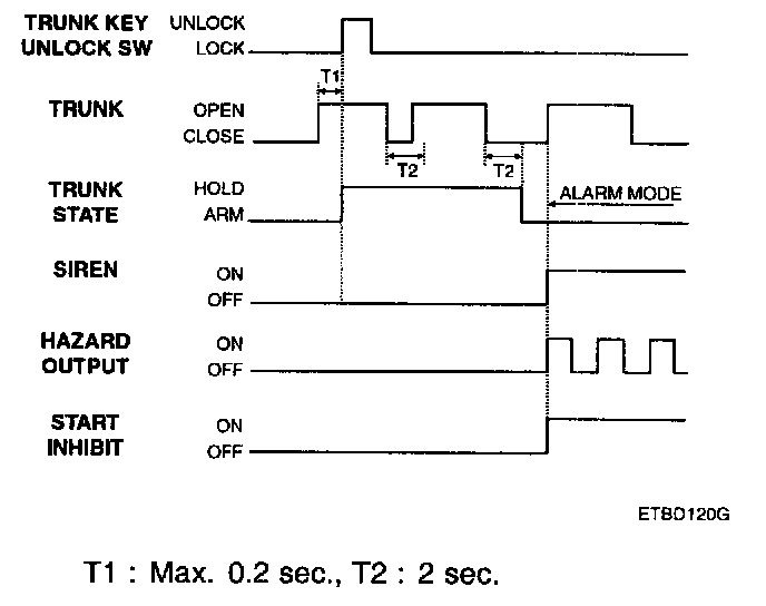 1. In case of opening the trunk by trunk unlock switch during arm state, the alarming is hold. When received transmitter (TX) trunk signal in arm state, trunk open by output trunk lid open relay signal or 500 ms and then holding alarm. But the door and hood except trunk is still in the arm state.