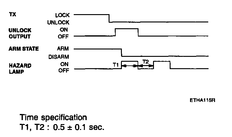 - Pressing the unlock button on the transmitter(TX) key. The hazard lamps shall be flashed twice for 1 sec period (of cycle), 50% duty rate.