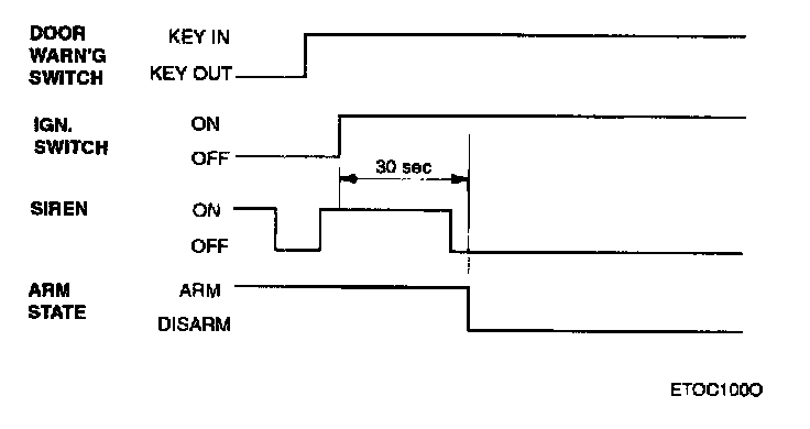 After the alarm state or start inhibit state are entered, if door warning switch on (key in ignition) & IGN 2 ON, it IGN 2 state is changed to OFF within 30 sec, remain in alarm state.