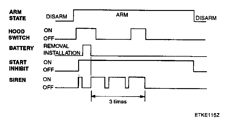 This system enters the armed state if it is in the prearmed state and,after 0.6 sec, check actuator lock and each door, hood and trunk close,and no door warning switch (no key in ignition).