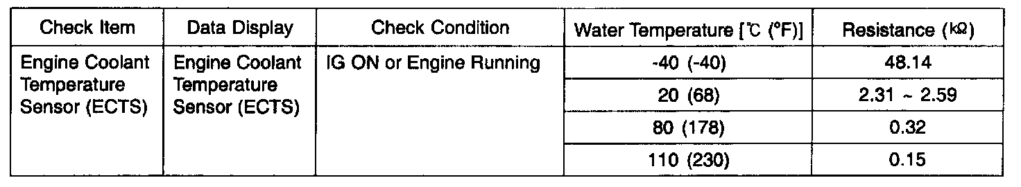 Engine Coolant Temperature Sensor (ECTS) installed in the engine coolant passage of the cylinder head detects the engine coolant temperature and emits signals to the ECM. This part employs a thermistor which is sensitive to changes in temperature. The electric resistance of the thermistor decreases in response to a temperature rise (NTC). The ECM determines engine coolant temperature by the sensor output voltage and provides optimum fuel enrichment when the engine is cold.