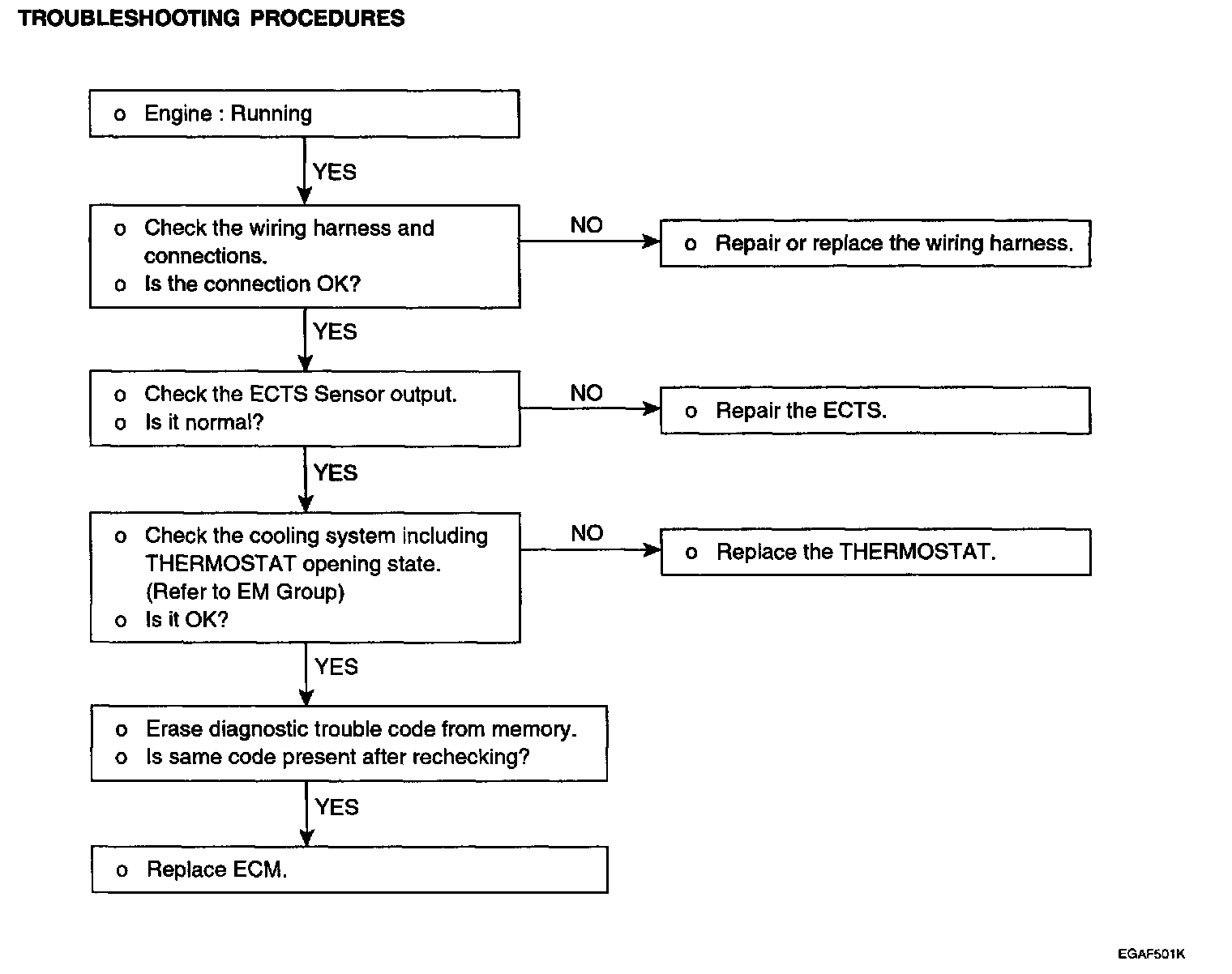 If the fast idle speed is not adequate or the engine gives off dark smoke during warm-up, the Engine Coolant Temperature Sensor (ECTS) might be the cause.