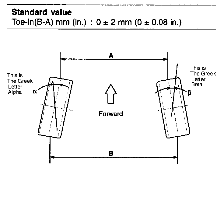 Toe-in (B-A or angle Alpha + Beta) is adjusted by turning the tie rod turnbuckles. Toe-in on the left front wheel can be reduced by turning the tie rod toward the rear of the car. Toe-in change is adjusted by turning the tie rods for the right and left wheels simultaneously at the same amount as follows.
