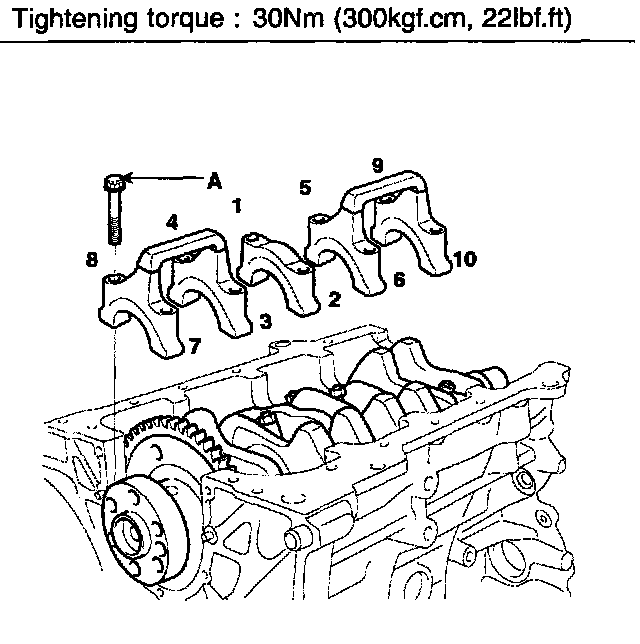 Main Bearing CapInstall and uniformly tighten the 10 bearing cap bolts (A), in several passes, in the sequence shown.