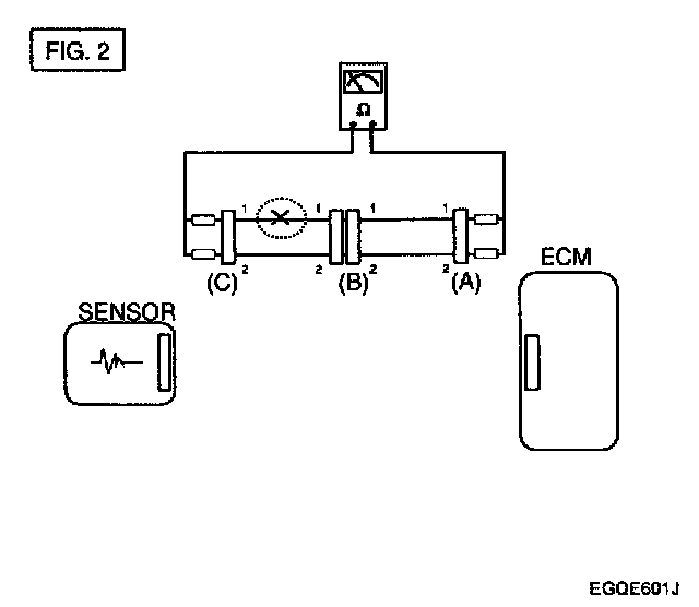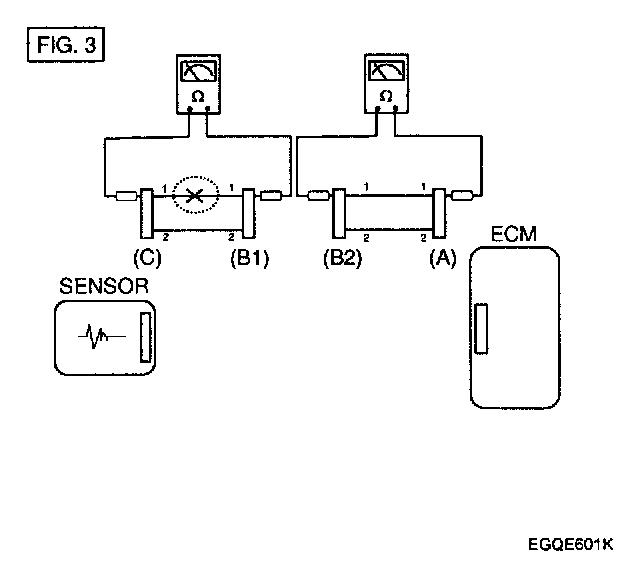 b. Disconnect connector (B), and measure for resistance between connector (C) and (B1) and between (B2) and (A) as shown in [FIG. 3].