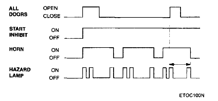- Audible (horn) and visual (hazard lamp) warnings are issued, for three cycles, each cycle 27 ± 2 sec. duration on, 10 ± 1 sec. off. The horn warning is continuously occurring during the on period. The hazard lamps operate with 1 sec period, 50 % duty rate during the on period.