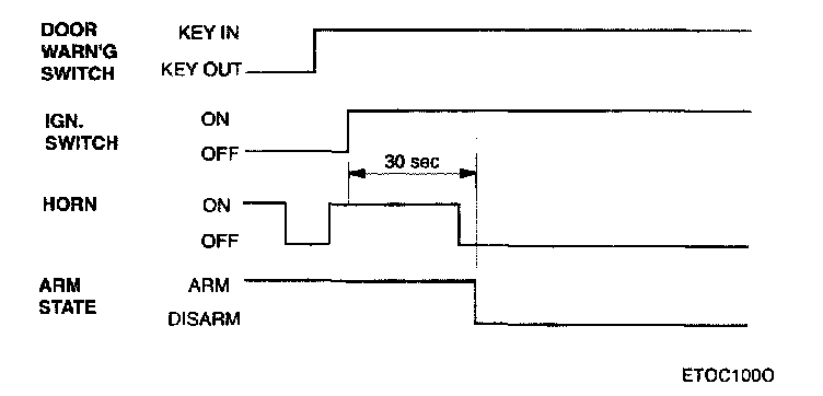 After the alarm state or start inhibit state are entered, if door warning switch on (key in ignition) & IGN 2 ON, if IGN 2 state is changed to OFF within 30 sec., remain in alarm state.