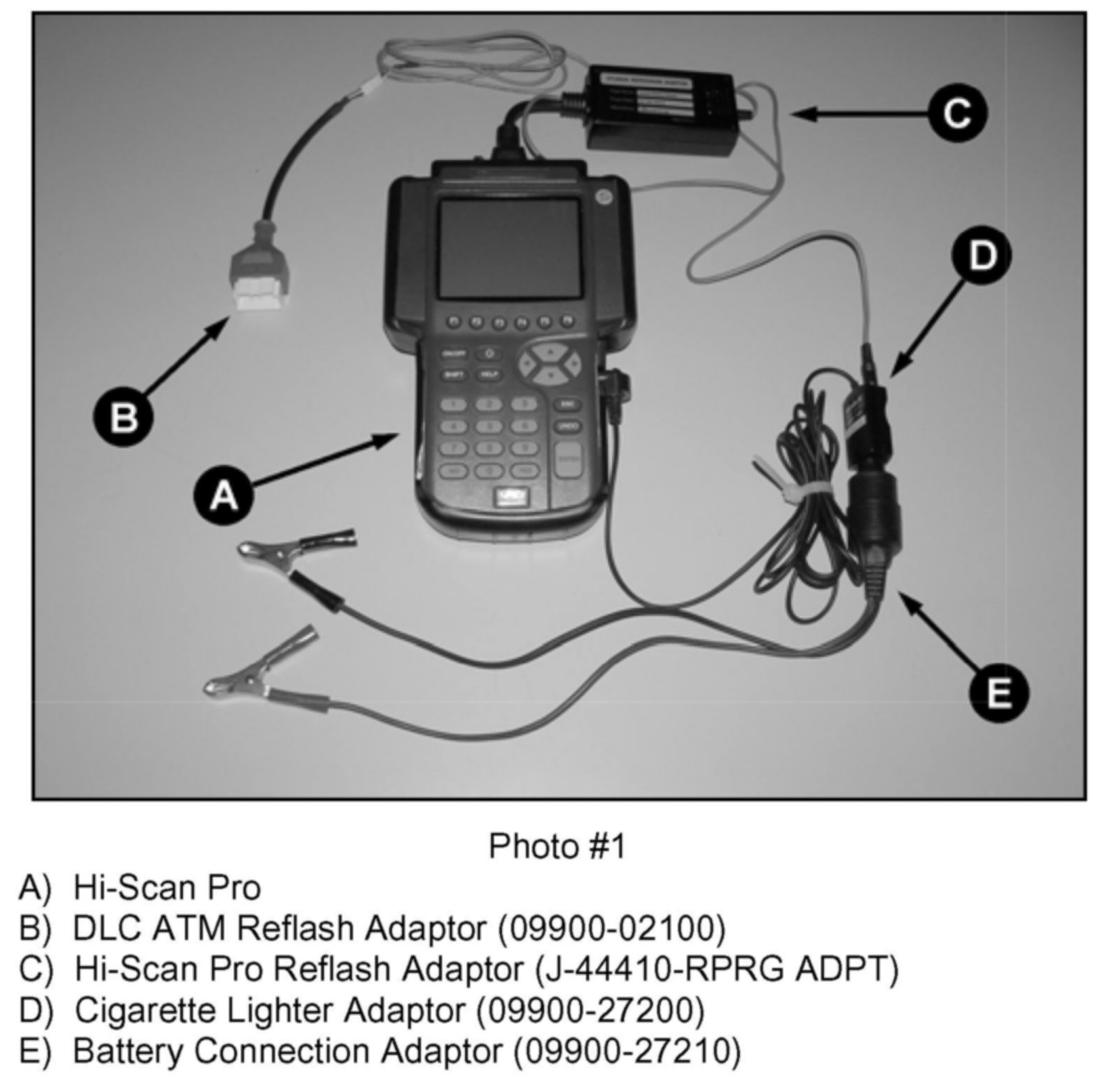 The 2.7L V6 Tucson requires a unique adaptor to reflash the automatic transaxle control module (TCM). The adaptor connects to the Engine Compartment Data Link Connector (DLC) and to the Hi-Scan Pro Reflash Adaptor (see photos # 1 & 2).