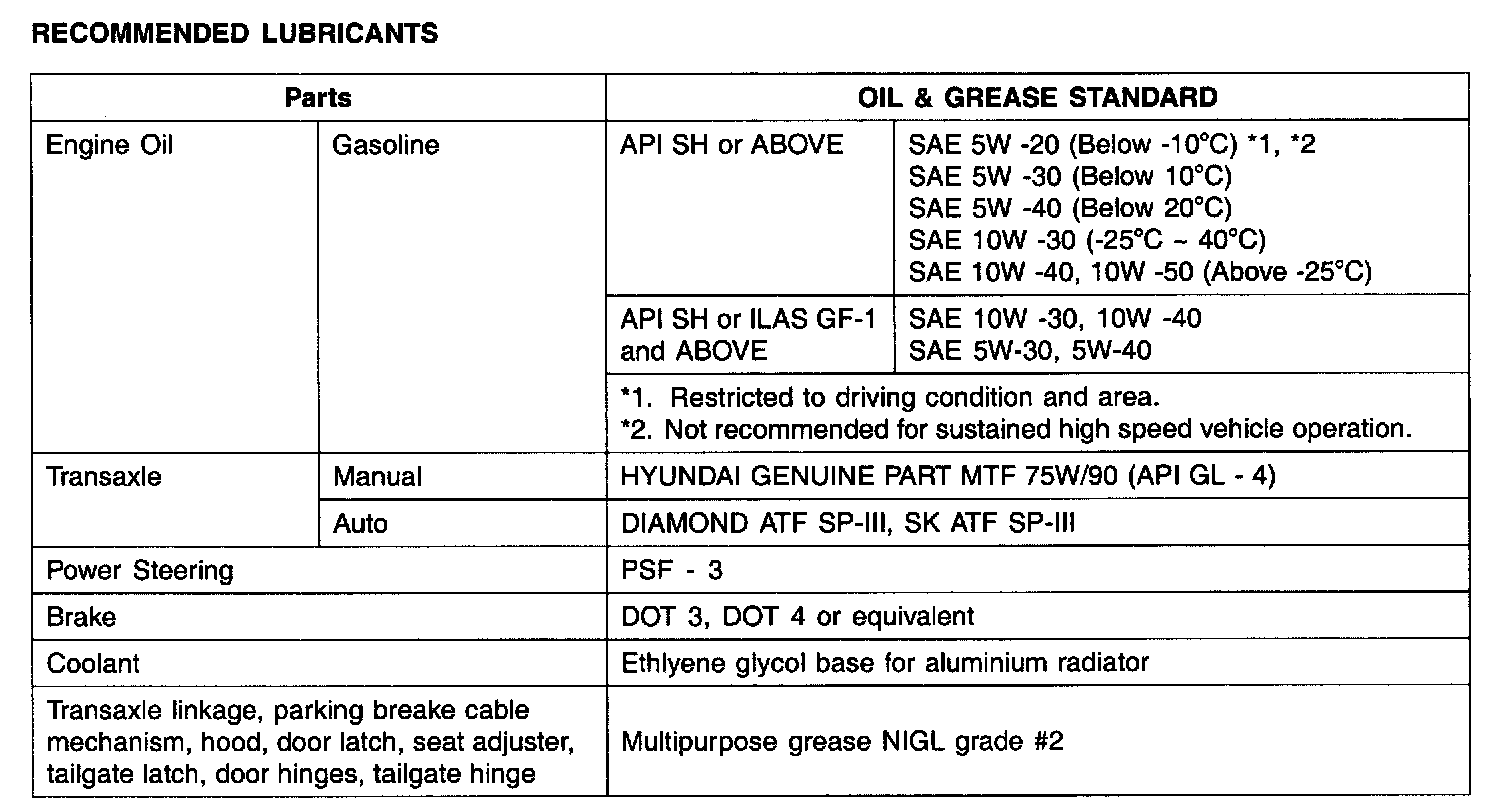 Using any other type of parts and fluid can cause serious damaged of the vehicle. RECOMMENDED LUBRICANTS