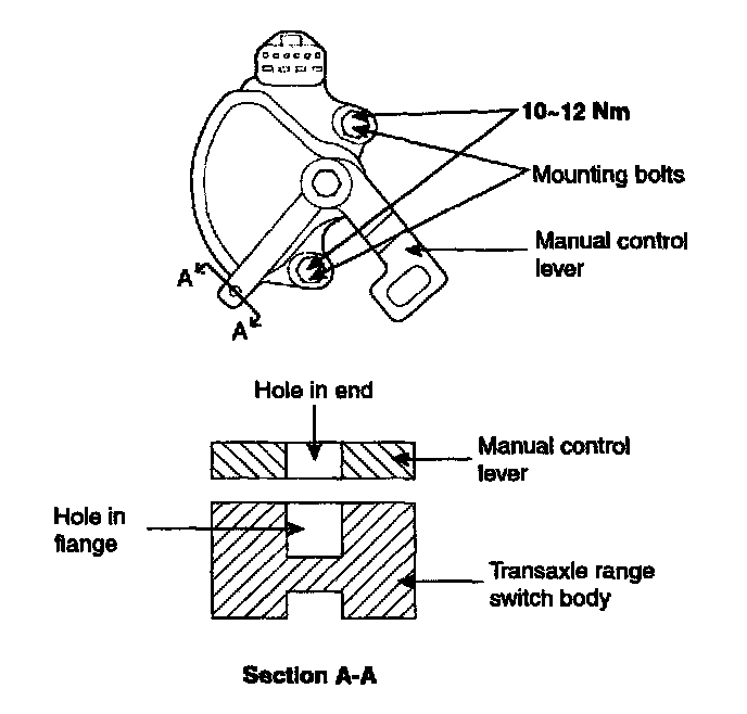 4. Loosen the transaxle range switch body mounting bolts and then turn the transaxle range switch body so the hole in the end of the manual control lever and the hole (cross section A-A in the figure) in the flange of the transaxle range switch body flange are aligned.