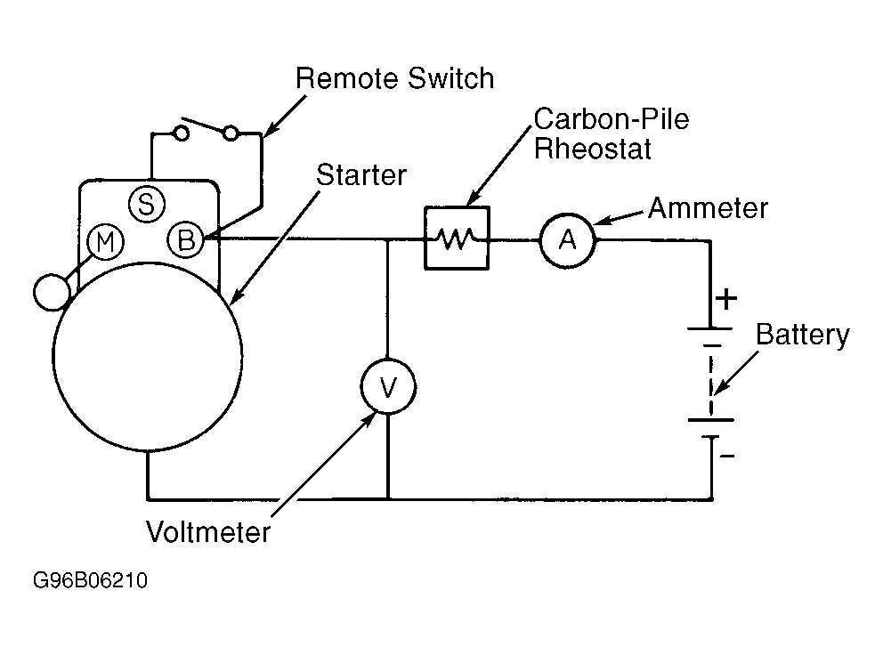 1. Place starter in soft-jaw vise. Rotate carbon pile rheostat to OFF position. Connect fully charged 12-volt battery, switch, voltmeter (15-volt scale), ammeter (100-amp scale), and carbon pile rheostat as shown in illustration. See Fig 1 . Adjust carbon pile rheostat until voltmeter indicates 11.0-11.5 volts.
