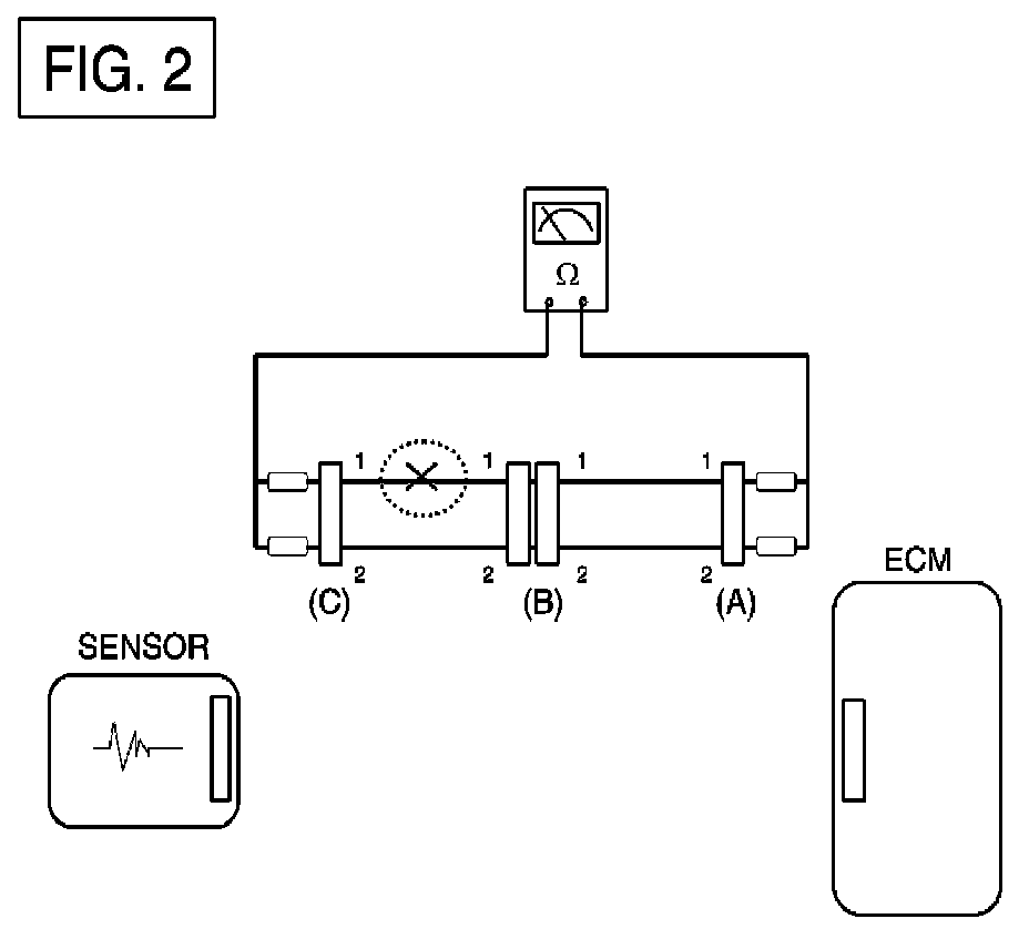 - Disconnect connectors (A), (C) and measure resistance between connector (A) and (C) as shown in [FIG. 2]. In [FIG.2.] the measured resistance of line 1 and 2 is higher than 1 Mohm and below 1 ohm respectively. Specifically the open circuit is line 1 (Line 2 is normal). To find exact break point, check sub line of line 1 as described in next step.