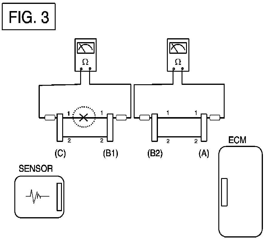 - Disconnect connector (B), and measure for resistance between connector (C) and (B1) and between (B2) and (A) as shown in [FIG. 3].In this case the measured resistance between connector (C) and (B1) is higher than 1 Mohm and the open circuit is between terminal 1 of connector (C) and terminal 1 of connector (B1).