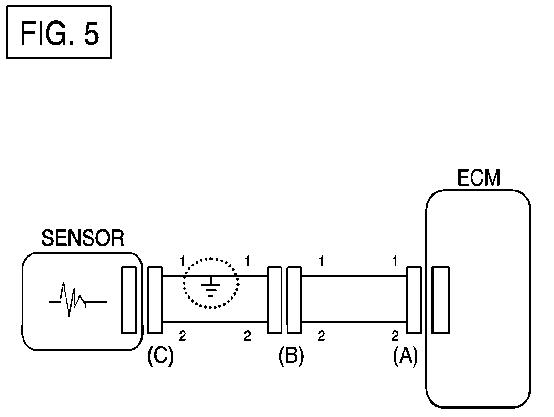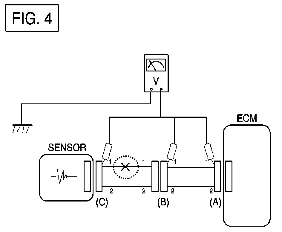 - With each connector still connected, measure the voltage between the chassis ground and terminal 1 of each connectors (A), (B) and (C) as shown in [FIG. 4].The measured voltage of each connector is 5 V, 5 V and 0 V respectively. So the open circuit is between connector (C) and (B).