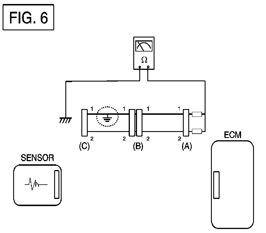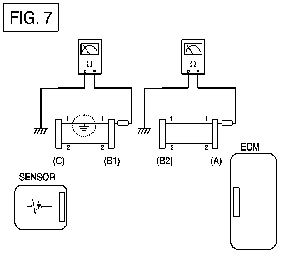 - Disconnect connector (B), and measure the resistance between connector (A) and chassis ground, and between (B1) and chassis ground as shown in [FIG. 7].The measured resistance between connector (B1) and chassis ground is 1 ohm or less. The short to ground circuit is between terminal 1 of connector (C) and terminal 1 of connector (B1).