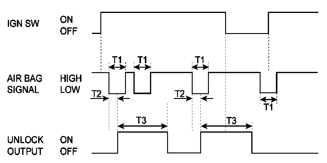 a. Whenever the air bag (below A/BAG) signal is inputted in the IG SW ON state, the unlock output shall be ON for T3.